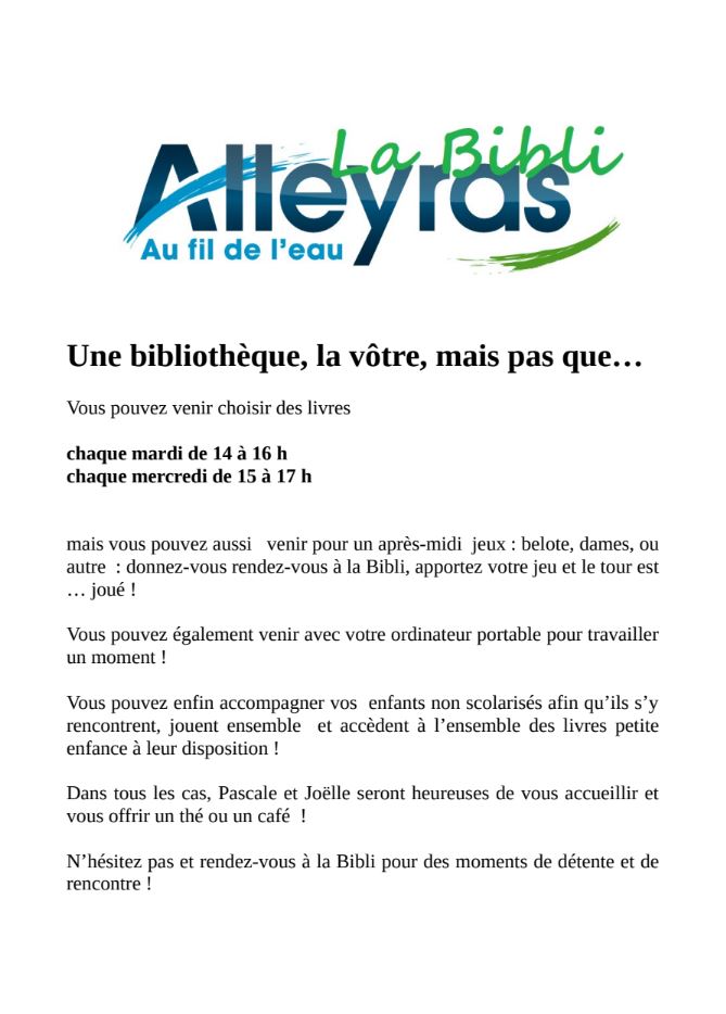 La bibliothèque d'Alleyras est installée au rez-de-chaussée de la salle de théâtre dans le bourg d'Alleyras. L'inscription est gratuite pour tous et sans formalité. Elle est ouverte toute l'année: